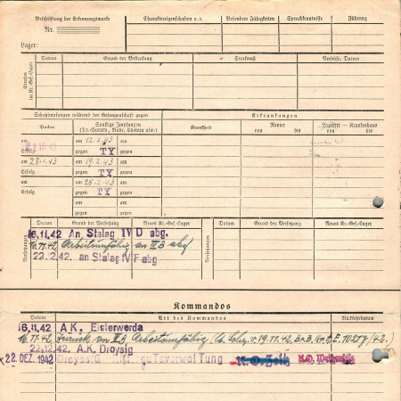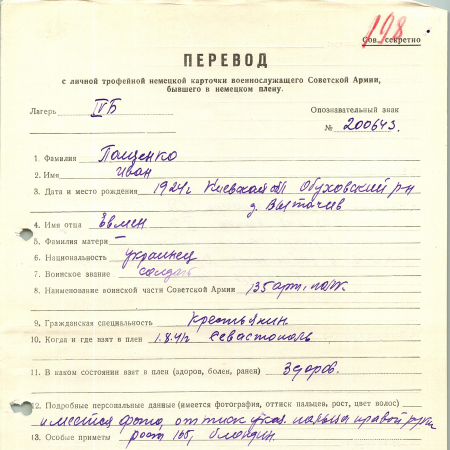 Пащенко Иван Евменович, 1924 г. р., д. Витачов, Обуховский район, Киевская область. Украинец. Рядовой, 135 артеллирийский полк. Попал в плен 01.08.1941 г. в г. Севастополь. С 16.11.1942 г. находился в лагере IVД, VIБ, с 22.12.1942 г. - в лагере IVФ. 16.11.1942 г. - рабочая командаАйстерверда, 22.12.1942 г. –рабочая команда Дройсиг, имение Теверваль Тунг.