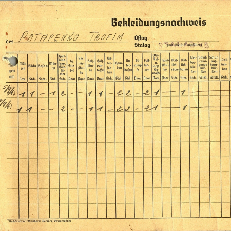 Потапенко Трофим Якубович, 1903 г. р., Киевская область. Украинец. Рядовой, санитарный батальйон. Попал в плен 12.05.1941 г. в Сутиевке. С 22.03.44 г. находился в лагере Х-У, с 14.03.45 г. - в лагере 308. 14.09.1943 г. - К.М. Фарге, 22.10.1943 г. – команда Шруебек 7042, 20.12.1943 г. - рабочая команда 473 Нойхауз. С 21.12.1943 г. - в Люнебург крепильные работы в шахтах (Нойхауз/Эльбе), с 15.03.1944 г. – лагерь, с 22.03.1944 г. - в лазарете Борзен.