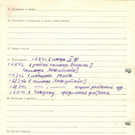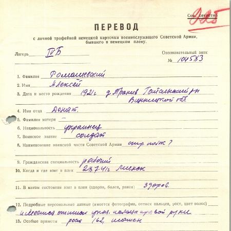 Ромашевский Алексей Донатович, 1921 г. р., д. Гранов, Гайсинский район, Винницкая область. Украинец. Рядовой стрелкового полка. Попал в плен 28.07.1941 г. в г Минск. С 02.08.1941 г. находился в лагере IV Ф, с 02.08.1941 г. - в рабочей команде Егидиен II команда Хоенштайн II, с 14.07.1942 г. - в лазарете Ремзе, 22.07.1942 г. - в команде Хоенштайн II. С 29.03.1944 г. - в команде Хоенштайн II старый районный суд, 06.12.1944 гю был переведен в Глаухау на прядильную фабрика.