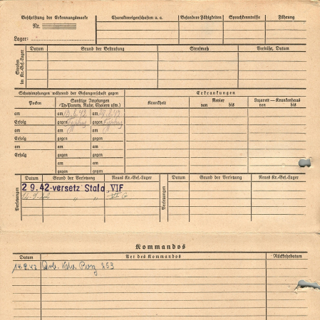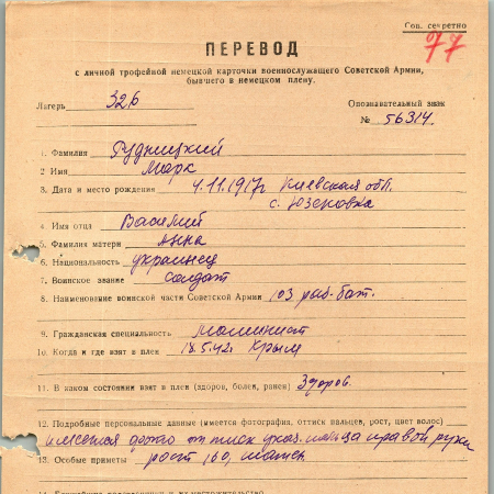 Руджицкий Марк Васильевич, 04.11.1917 г. р., с. Юзефовка, Киевской области. Украинец. Рядовой, 103 рабочий батальйон. Попал в плен 18.05.1942 г. в Крыму. С 02.09.1942 г. находился в лагере VI Ф, с 14.09.1942 г. - в лагере VIГ, с 14.09.1942 г. - в рабочей команде Торц 253.