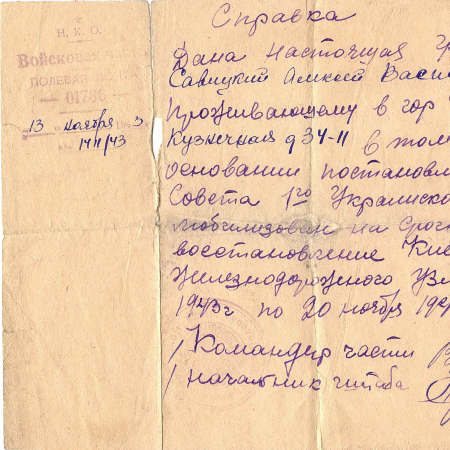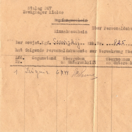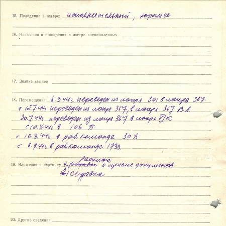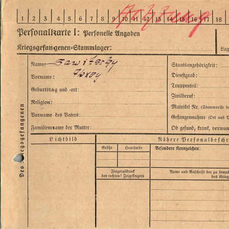 Савицкий Алексей Васильевич, 1910 г. р., г. Киев. Украинец. Рядовой, 7 артиллерийский часть. Попал в плен в Аратове. 06.03.1944 г. был переведен из лагеря 301 в лагерь 367, 12.07.1944 г. - переведен из лагеря 367, в лагерь 367 В.Л, 30.07.1944 г. - переведен из лагеря 367 в лагерь VIK. С 10.08.1944 г. находился в лагере 106Б, с 10.08.1944 г. - в рабочей команде 308, 06.09.1944 г. - в рабочей команде 1738.