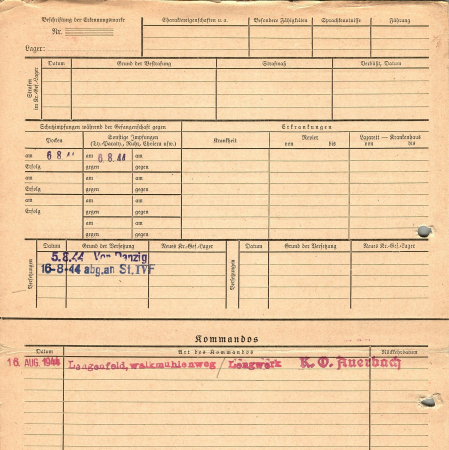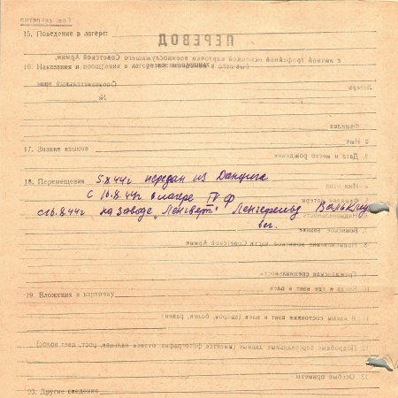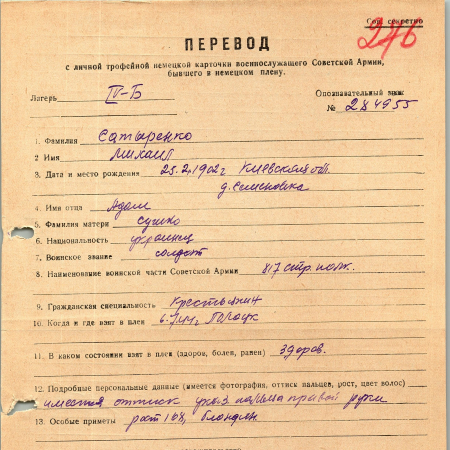 Сатыренко Михаил Адамович, 25.02.1902 г. р., д. Семеновка, Обуховский район, Киевская область. Украинец. Рядовой, 817 стрелковый полк. Попал в плен 06.07.1944 г. в г. Полоцк. 05.08.1944 г. был передан из Данцига. С 16.08.1944 г. находился в лагере IV Ф, с 16.08.1944 г. - на заводе «Ленгверк» Ленгефельд.