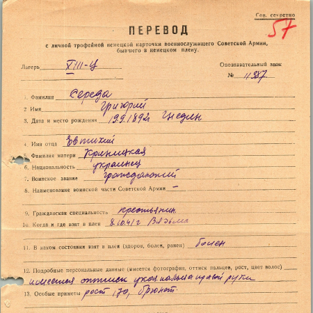 Середа Григорий Евтихьевич, 19.09.1892 г. р., д. Гнедин, Бориспольский район, Киевская область. Украинец. Гражданский. Попал в плен 08.10.1941г. в г. Вязьма.