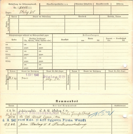 С 01.10.1941 г. находился в лагере II-Б, с 28.03.1942 г. - в лагере II-Ц. 08.08.1941 г. был переведен в лагерь IIД Щенвальде строительство дорог, 12.09.1941 г. - на строительство дорог Клаусхаген Бан Эшпельбург, 27.03.1942 - на фирму Гебрюдер Вендт Эгеззин /Пом. С 08.04.1942 г. был в команде 11403 Эгеззин фирма Вендт, с 19.09.1942 в лагере IIA Нойбранденбург.