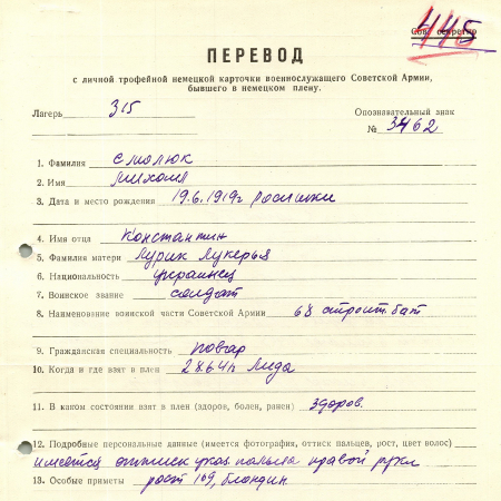 Смолюк Михаил Константинович, 19.06.1919 г. р., с. Росишки, Тетиевский район, Киевская область. Украинец. Рядовой, 68 строительный батальйон. Попал в плен 28.06.1941 г. в г. Лида.