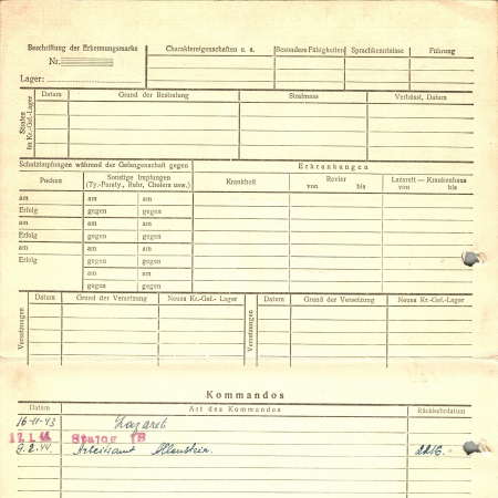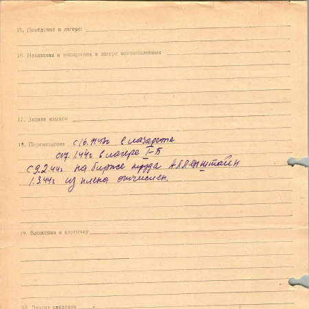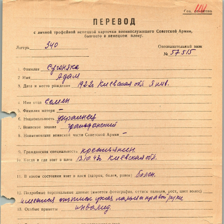 Сугоняка Адам Семенович, 1922 г. р., стн. Янов, Новошепелицкий район, Киевская область. Украинец. Гражданский. Попал в плен 13.10.1942 г., Киевская область. С 16.11.1943 г. находился в лазарете, с17.01.1944 в лагере I-Б, с 09.02.1944 на бирже труда Алленштайн. 01.03.1944 г был отчислен из плена.