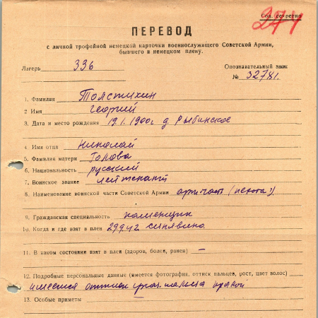 Толстихин Георгий Николаевич, 19.01.1900 г. р., д. Рыбинское. Русский. Лейтенант, артиллерийская часть (пехота). Попал в плен 29.09.1942 г. в Синявино. 11.02.1943 г. был направлен в Вандциагала (?), 03.05.1943 г. - в Шпортплац, 07.10.1943 г.- в Гофенлагерь. С 22.05.1944 г. находился в команде 6185 Дипгольц, с 27.10.1944 г. - в команде 5798 Гнеде.