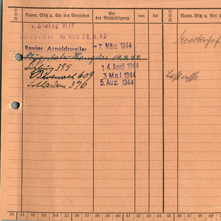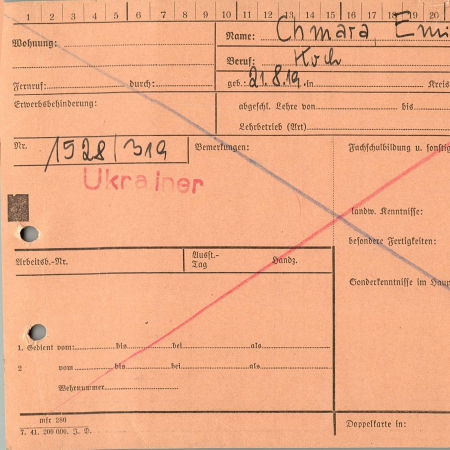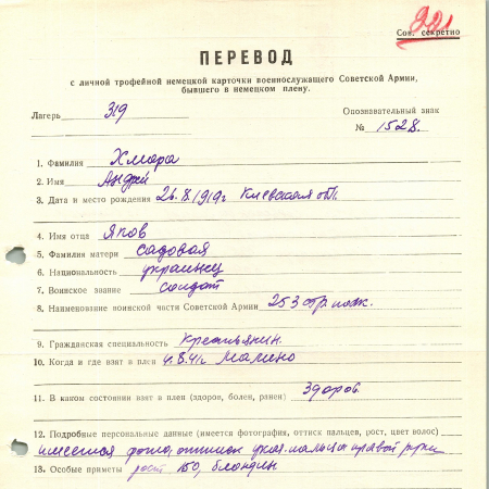 Хмара Андрей Яковлевич, 26.08.1919 г. р. Киевская область. Украинец. Рядовой, 253 стрелковый полк. Попал в плен 04.08.1941 г. в Малино. 20.08.1942 г. был переведен из лагеря 326 в лагерь VI Г. С 28.08.1942 г находился в рабочей команде 480 Баесвайлер, с 14.04.1944 г. - в рабочей команде 395 Зигбург, с 03.05.1944 г. - в рабочей команде 609 Берренрат, с 05.08.1944 г. - в рабочей команде 376 Шладерн.