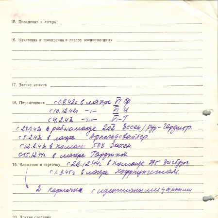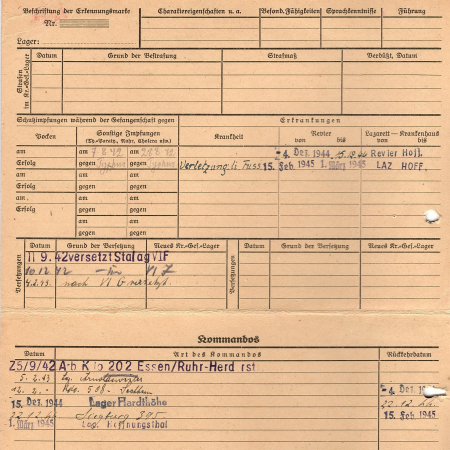 С 11.09.1942 г. находился в лагере VI Ф, с 10.12.1942 г. - в лагере VI И, 04.02.1943 г. - в лагере VI-Г, с 25.09.1942 г. - в рабочей команде 202 Эссен/Рур. 05.02.1943 г. был направлен в лагерь Арнольдсвайлер, 12.02.1943 г. - в команду 508 Захен, 15.12.1944 г. - в лагерь Гардхое. С 22.12.1944 г. был в команде 395 Зигбург, 01.03.1945 г. - в лагере Хоффнунгсталь.