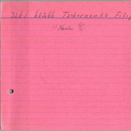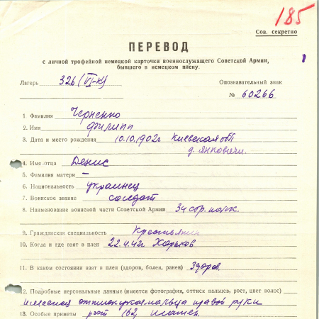 Черненко Филипп Денисович, 10.10.1902 г. р., д. Янковичи, Васильковский район, Киевская область. Украинец. Рядовой, 34 стрелковый полк. Попал в плен 22.04.1942 г. в Харькове.