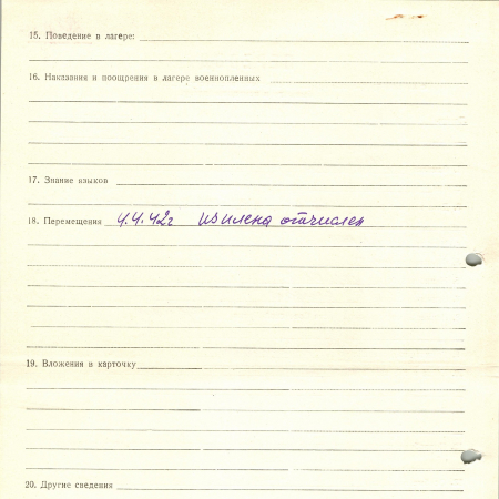 Шевченко Ефрем Миронович, 1916 г. р., с. Московцы (по дислокации с. Стайки, в Ржищевском районе Киевской области). Украинце. Рядовой стрелкового полка. 04.04.1942 г. был отчислен из плена.