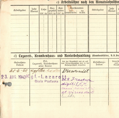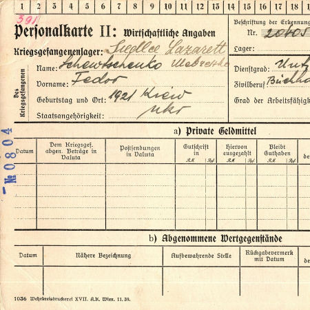 Шевченко Федор Александрович, 03.12.1921 г. р., Киевская область. Украинец. Ст. сержант, 671 артиллерийский полк. Попал в плен 25.05.1942 г. в с. Лозовая. С 30.05.1943 г. находился в рабочей команде 366/142, дорожное строительство Седльце, с 01.04.1943 г. - работал поваром. 04.06.1943 г. бежал из рабочей команды. 06.07.1943 г. было послано письмо в полевую жандармерию в Мало-Березянку о его розыске.