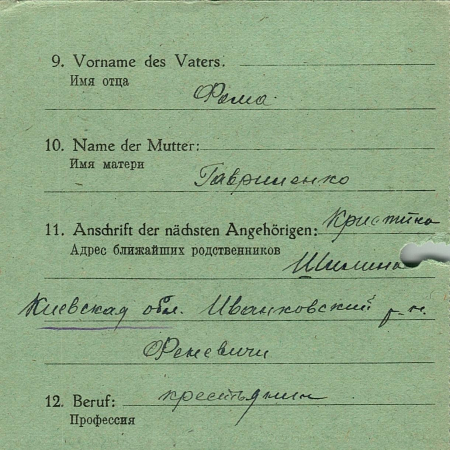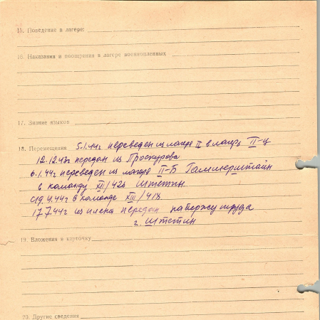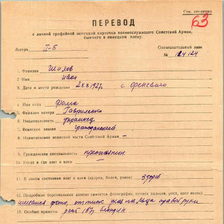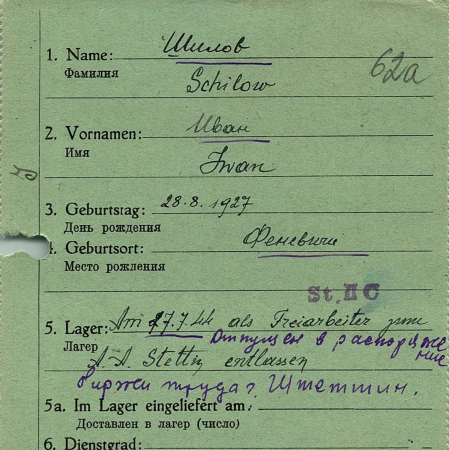 Шилов Иван Фомич, 28.08.1927 г. р., с. Феневичи, Иванковский район, Киевская область. Украинец. Гражданский. 05.01.1944 г. был переведен из лагеря II в лагерь II-Ц, 12.12.1943 г. - переведен из Проскурова, 06.01.1944 г. -переведен из лагеря II-Б Хаммерштайн в команду XII/426 Штеттин. С 19.04.1944 г. находился в команде XIII/418. 17.07.1944 г. - из плена передан на биржу труда г. Штеттин.