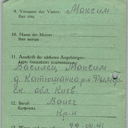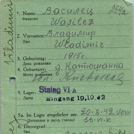 Василец Владимир Максимович, 01.08.1915 г. р., с. Катюжанка, Дымерский р-н, Киевская обл. Солдат, 139 стрелковый полк. Попал в плен: 22.07.41 г. – Тарнополь (г. Тернополь), лагерь 58.