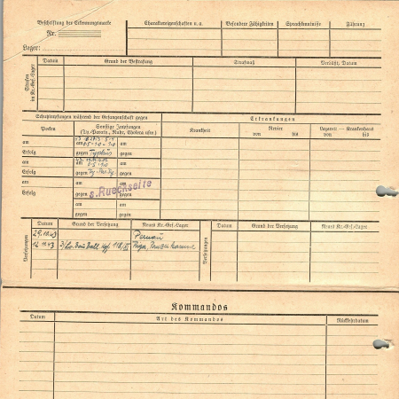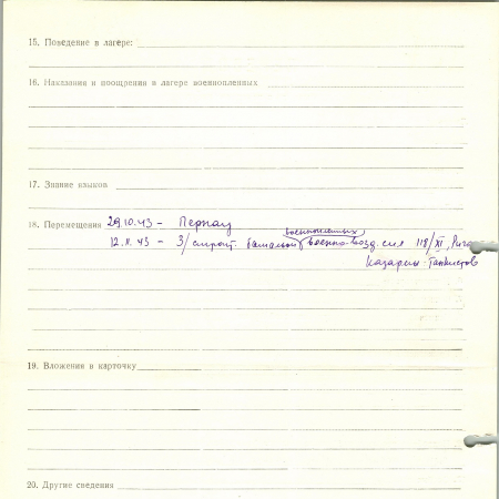 Перемещения: 29.10.43 – Пернау; 12.11.43 – 3 строительный батальон военнопленных военно-воздушных сил 118/ХI Рига, Казармы танкистов.