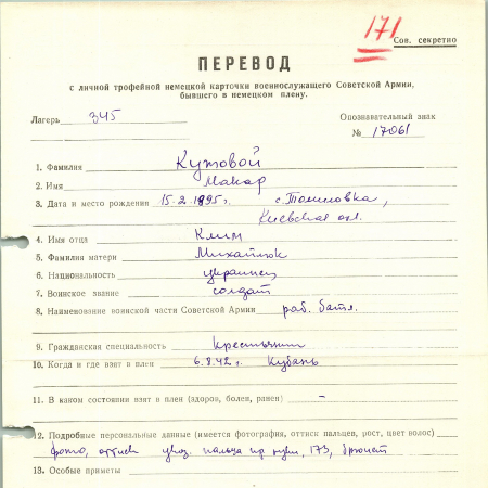 Кутовой Макар Климович – 15.02.1895 г.р., с. Томиловка, Киевская обл. Солдат, рабочий батальон. Попал в плен: 06.08.42 г., г. Кубань.