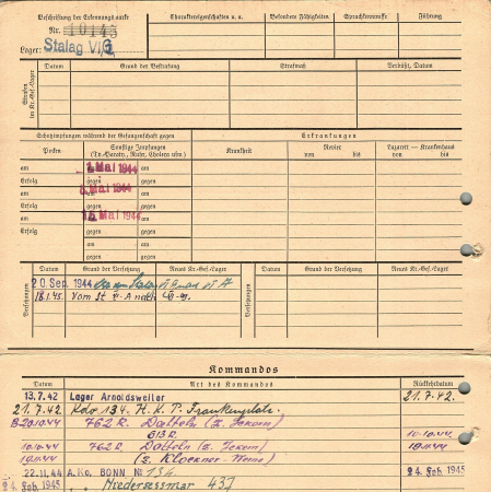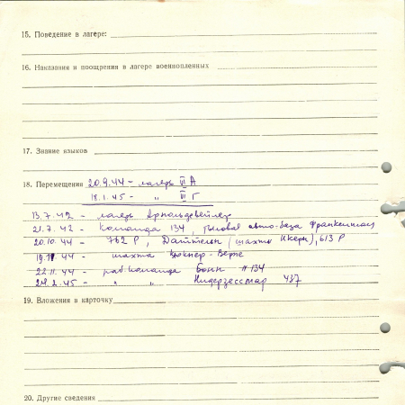 Перемещение: 20.09.44 – Лагерь VI А; 18.01.45 – VI Г; 13.07.42 – лагерь Арнольдевейлер; 21.07.42 – команда 134, тыловая авто-база Франкенплац.; 20.10.44 – 762Р, Даттельн (шахты Икерн), 613Р; 19.11.44 – шахта Клокнер-Верне; 22.11.44 – рабочая команда Бонн №134; 24.02.45 – рабочая команда Нидерзессмар 437.