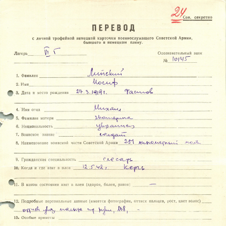 Липский Иосиф Михайлович – 27.03.1919 г.р. Фастов. Солдат, 251 минометный полк. Попал в плен: 12.05.42 г., г. Керчь.
