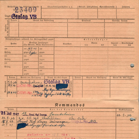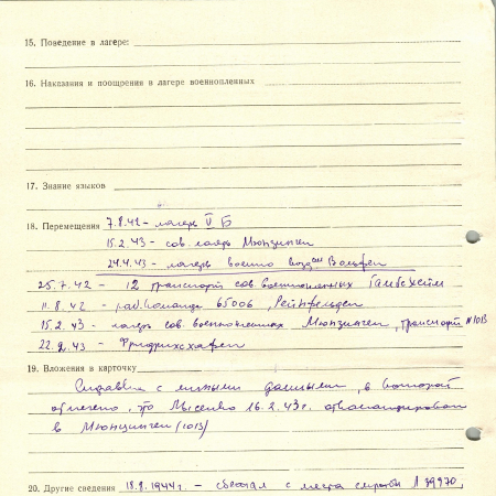 Перемещения: 07.08.24 – лагерь V B; 15.02.43 – сов. Лагерь Мюнзинген; 24.04.43 – лагерь военно-воздушных сил Вольфен; 25.07.42 – 12 транспорт. Сов. Военнопленных Гамбехейм; 11.08.42 – рабочая команда 65006, Рейнфельден; 15.02.43 – лагерь сов. военнопленных Мюнзинген, транспорт №1013; 22.02.43 – Фридрихсхафен; 18.08.1944 – сбежал из Л39970б Париж.