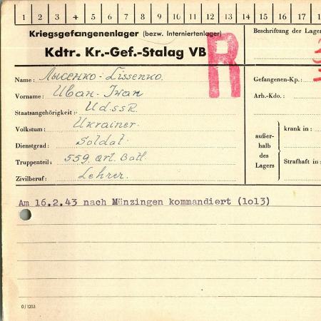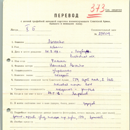 Лысенко Иван Филиппович – 20.02.1911 г.р., с. Подварки, Киевская область. Солдат, 559 артиллерийский полк, 2 батальон, полевая почта 204. Попал в плен: 27.05.42 г., г. Харьков.