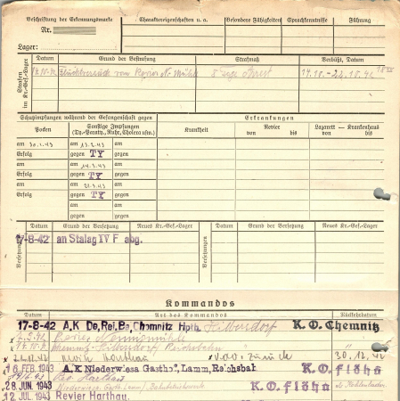 Перемещения: 17.08.42 – лагерь IV F; 17.08.42 – рабочая команда, Хемниц, Хильберсдорф; 07.09.42 – госпиталь Неннигмюле; 14.10.42 – Хемниц, Хильберсдорф, железная дорога; 21.12.42 – госпиталь Хартау; 16.02.43 – рабочая команда Нидервиза, р-н Флеха; 19.06.43 – госпиталь Хартау; 28.06.43 – Нидервиза, железнодорожная мастерская; 12.07.43 – госпиталь Хартау; 15.07.43 – Нарсдорф, Танне у крестьянина Хельм.Кречьмар, Брейгенборг; 12.10.44 – госпиталь Хартау; 17.10.44 – Нарсдорф Танне; 29.11.44 – Герингсвальде (лесопильный завод Альфред Беер); 16.12.44 – Обергрефенхайн, железнодорожная мастерская Нарсдорф; 28.12.44 – госпиталь Хартау;28.12.44 – Обергрефенхайн.