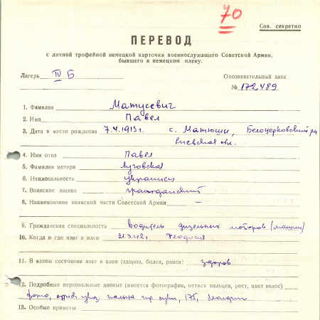 Матусевич Павел Павлович – 07.04.1913 г.р., с. Матюши, Белоцерковский р-н, Киевская обл. Гражданский. Попал в плен: 21.03.42 г., г. Феодосия;