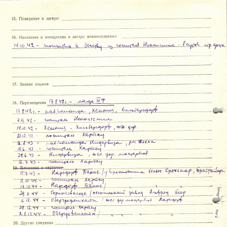 Наказания и поощрения в лагере военнопленных: 14.10.42 – попытка к бегству из госпиталя Неннигмюле – 8 суток строгого ареста.