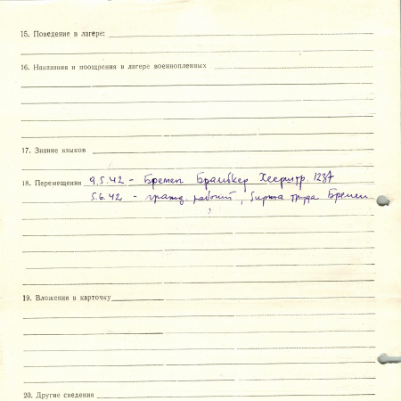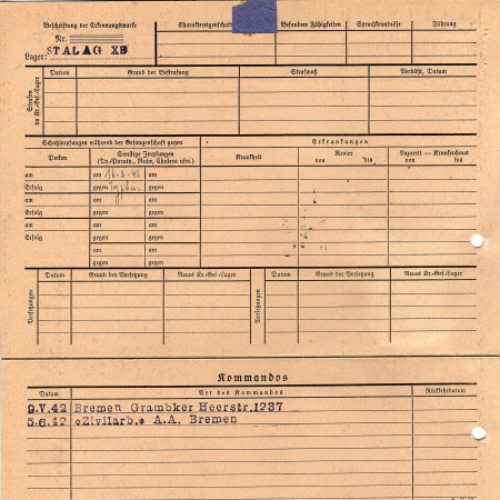 Перемещения: 09.05.42 – Бремен Грамбкер Хеерштр 1237, 05.06.42 – гражданский рабочий, биржа труда, Бремен.