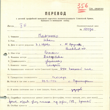 Панченко Иван Романович – 07.01.1909 г.р., с. Малый Круполь. Солдат, 640 конный полк. Попал в плен: 23.09.1941 г., с. Пристромы.