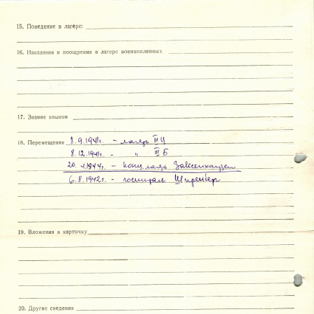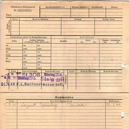 Перемещения: 08.09.1941 г. – лагерь III C, 08.12.1941 – лагерь III B, 20.04.1944г. – концлагерь Заксенхаузен, 06.08.1942 г. – госпиталь Шпремберг.