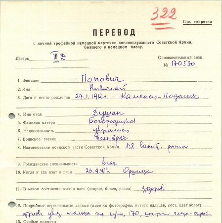 Попович Николай Душанович – 27.01.1912 г., г. Каменецк-Подольск. Военврач, 158 санитарная рота. Попал в плен: 23.09.41 г., Оршица.