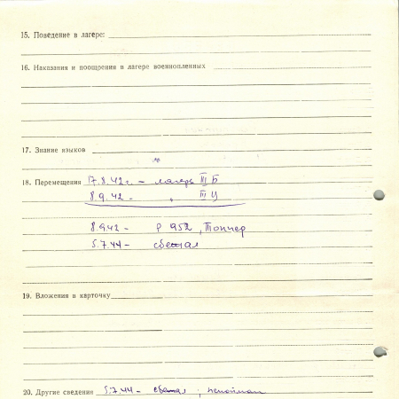 Перемещения: 17.08.42 – лагерь III В, 08.09.42 – III C, 08.09.42 – Р 952, Топпер, 05.07.44 – сбежал, не пойман.