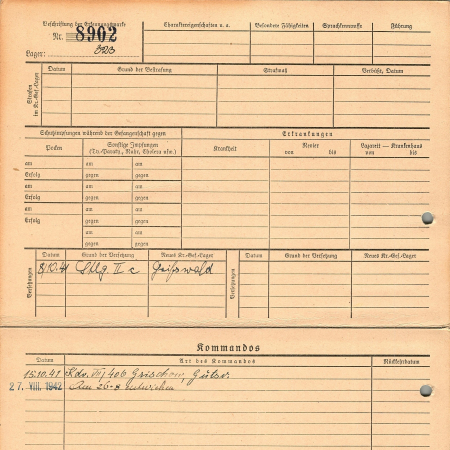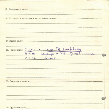 Перемещения: 08.10.41 г. – лагерь II C, Грейфсвальд, 15.10.41г. – команда VII/406 Гришов, 27.08.42 – сбежал.