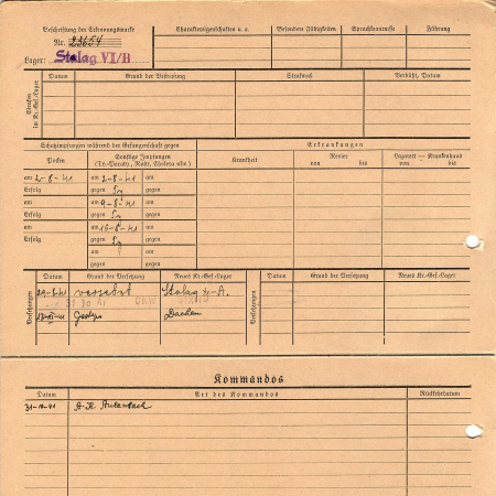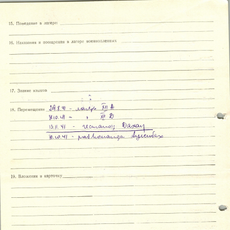 Перемещения: 29.08.41 – лагерь ХII A, 31.10.41 – лагерь ХІІ D, 13.11.41 – гестапо Дахау, 31.10.41 – рабкоманда Ауленбах.