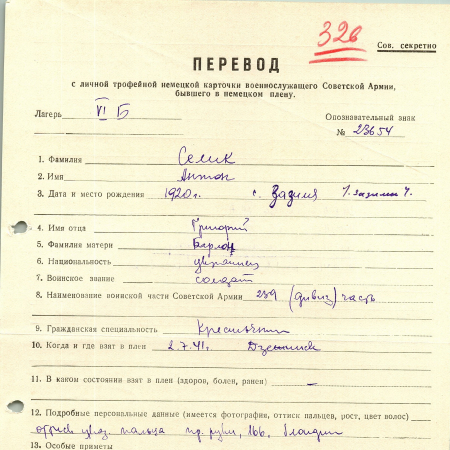Селик Антон Григорьевич – 1920 г.р., с. Зазимье, Броварской р-н, Киевская область. Солдат, 239 дивизионная часть. Взят в плен: 02.07.41 г., Дзержинск.
