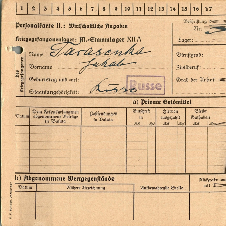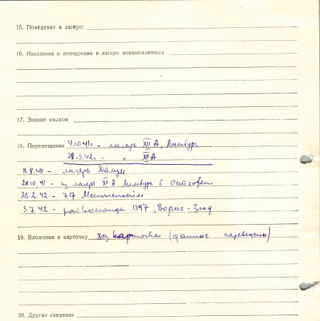 Перемещения: 04.10.41 – лагерь ХII А, Лимбург. 29.03.42 – лагерь ХII А, 11.08.41 – лагерь Далум, 20.10.41 – из лагеря ХII А Лимбург в Остхофен, 23.02.42 – 717 Меттенхайм, 03.07.42 – рабочая команда 1397, Вормс –Зюд.