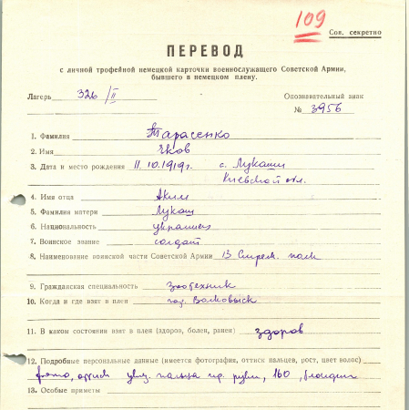 Тарасенко Яков Акимович – 11.10.1919 г.р., с. Лукаши, Киевской обл. Солдат, 13 стрелковый полк. Попал в плен: г. Волковыск.