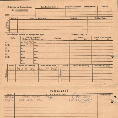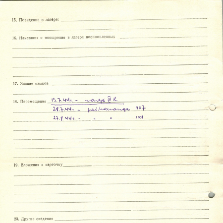 Перемещения: 13.07.44 – лагерь VI K, 28.07.44 – рабочая команда 1107, 27.08.44 – рабочая команда 1101.