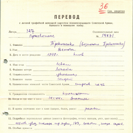 Трокопенко (возможно Прокопенко) Демьян Иванович – 1898 г.р., г. Киев. Солдат, стрелковая часть. Взят в полен:14.01.44 г., г. Винница, ранен.