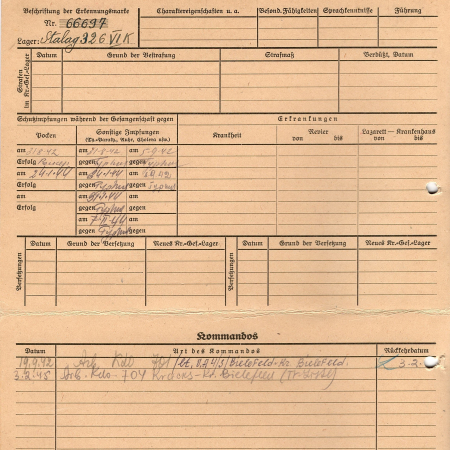 Перемещения: 19.09.42 – рабочая команда 701, Билефельд, 03.02.45 г. – рабочая команда 704, Кракс, район Билефельд.