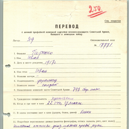 Гиренко Иван Иванович, 1917 г.р. Рядовой, 797 стр. полк. Взят в плен 22.01.1944 г., Уманск. Шталаг 319. 07.02.1945 г. переведён из лагеря III-ц в лагерь VI-Г. С 02.03.1945 г. в лагере VI-Г.