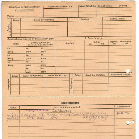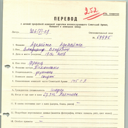 Адомейтес Владимир Францевич, 1918 г.р., г. Киев. Рядовой, 145 С.П. Взят в плен 27.09.1941 г., г. Полтава. Шталаг 326 (VI-K). C 16.09.1943 г. в рабочей команде 1117 Реда - Виденбрюк. С 09.10.1944 г. в рабочей команде 1101.
