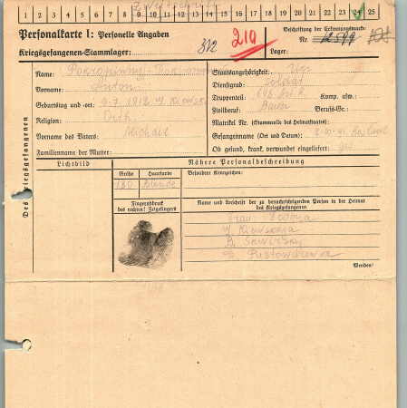 Покропенный Антон Михайлович, 09.07.1912 г.р., с. Пустоваровка, Сквирский р-н, Киевская обл. Рядовой, 646 арт.полк. Попал в плен 02.10.1941 г., Рослав. Шталаг 312.