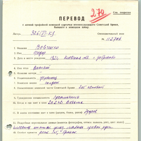 Вовченко Фёдор Васильевич, 1921 г.р., с. Добриново Киевская обл. Рядовой, 205 автобат. Попал в плен 20.02.1942 г., Вязьма. Шталаг 326 (VI-К). С 12.02.1943 г. в рабочей команде 1309 Гут Барнтруп уезд Л-Ланд.