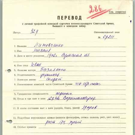 Литовченко Михаил Иванович, 1902 г.р., Сумская обл. Рядовой, 410 стр. полк. Взят в плен 12.07.1942 г., Ворошиловград. Шталаг 329. С 18.05.1943 г. в лагере VI Ф. С 14.02.1944 г. в команде 15. С 08.08.1944 г. в спецлагере Ибенбюрен.