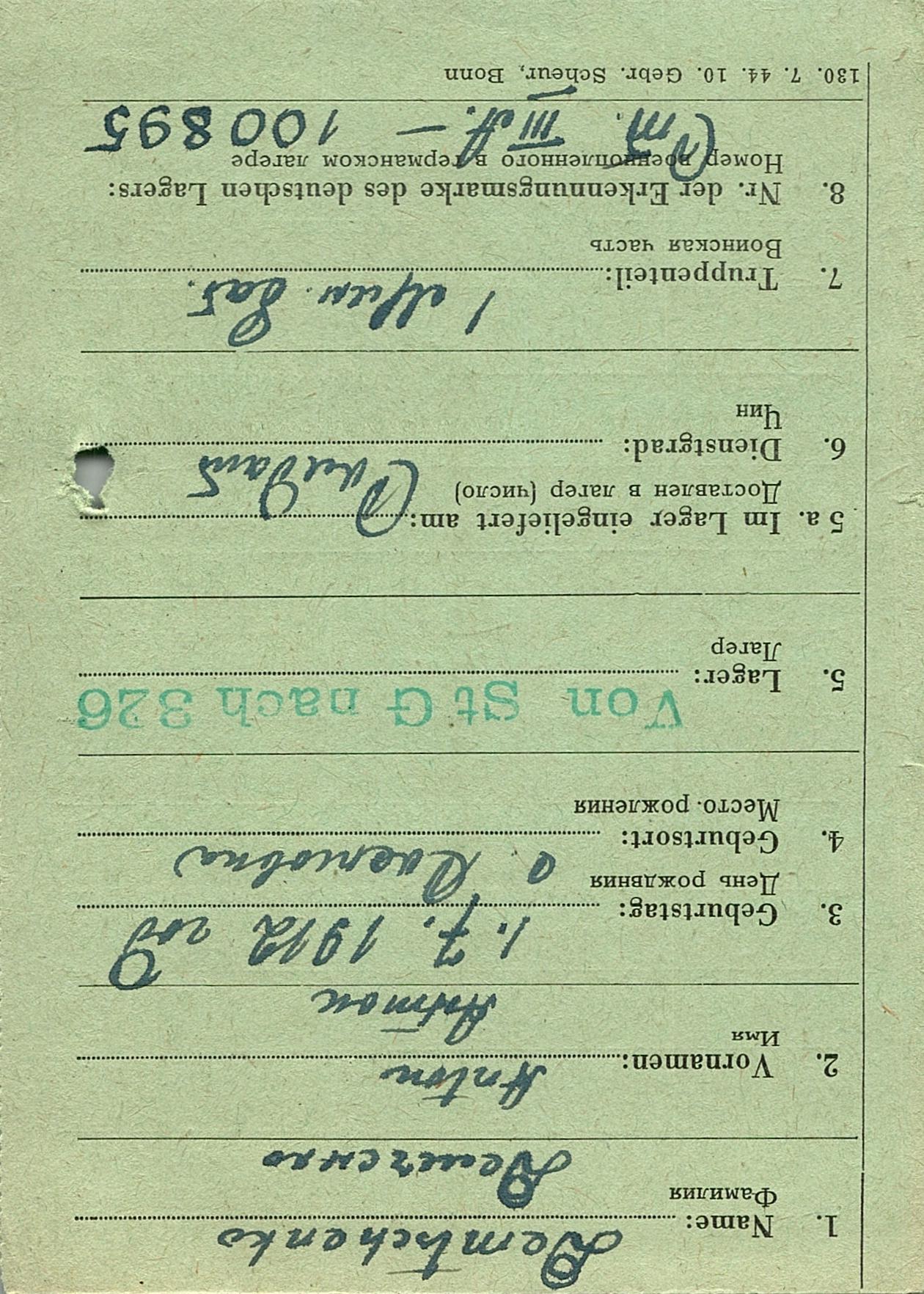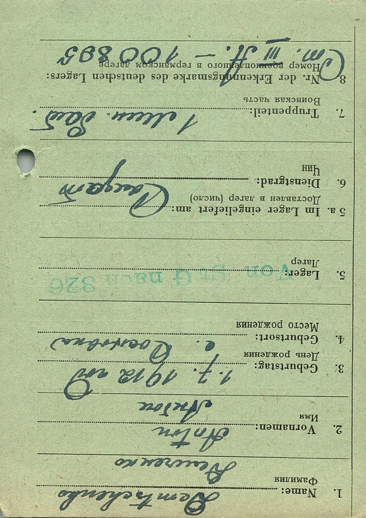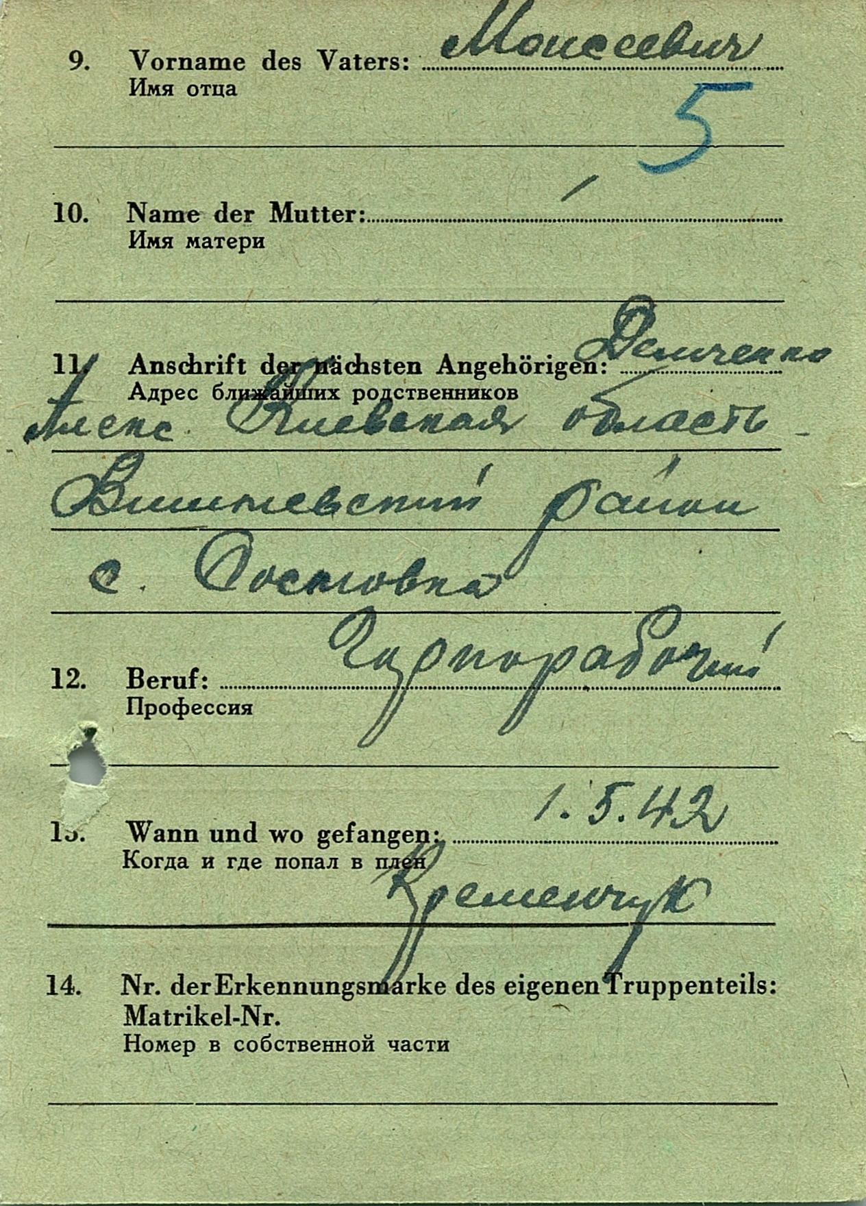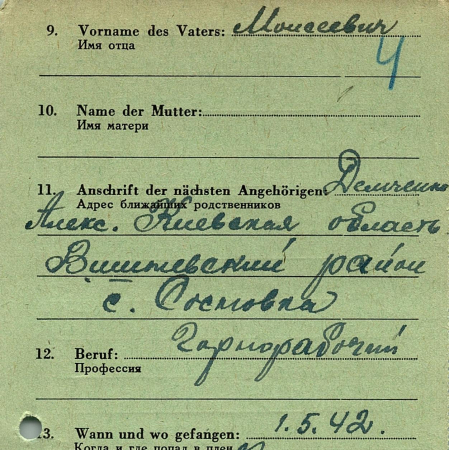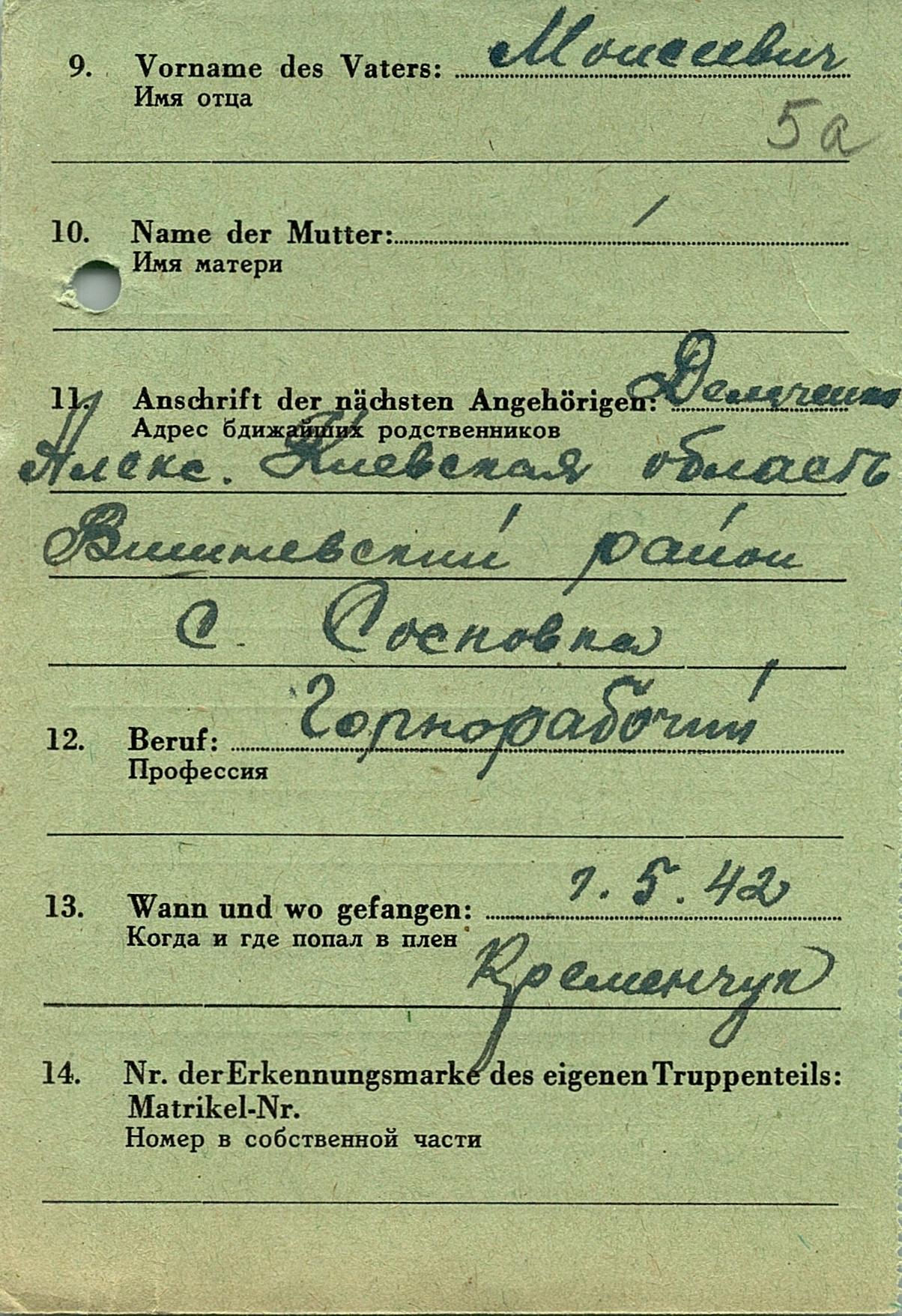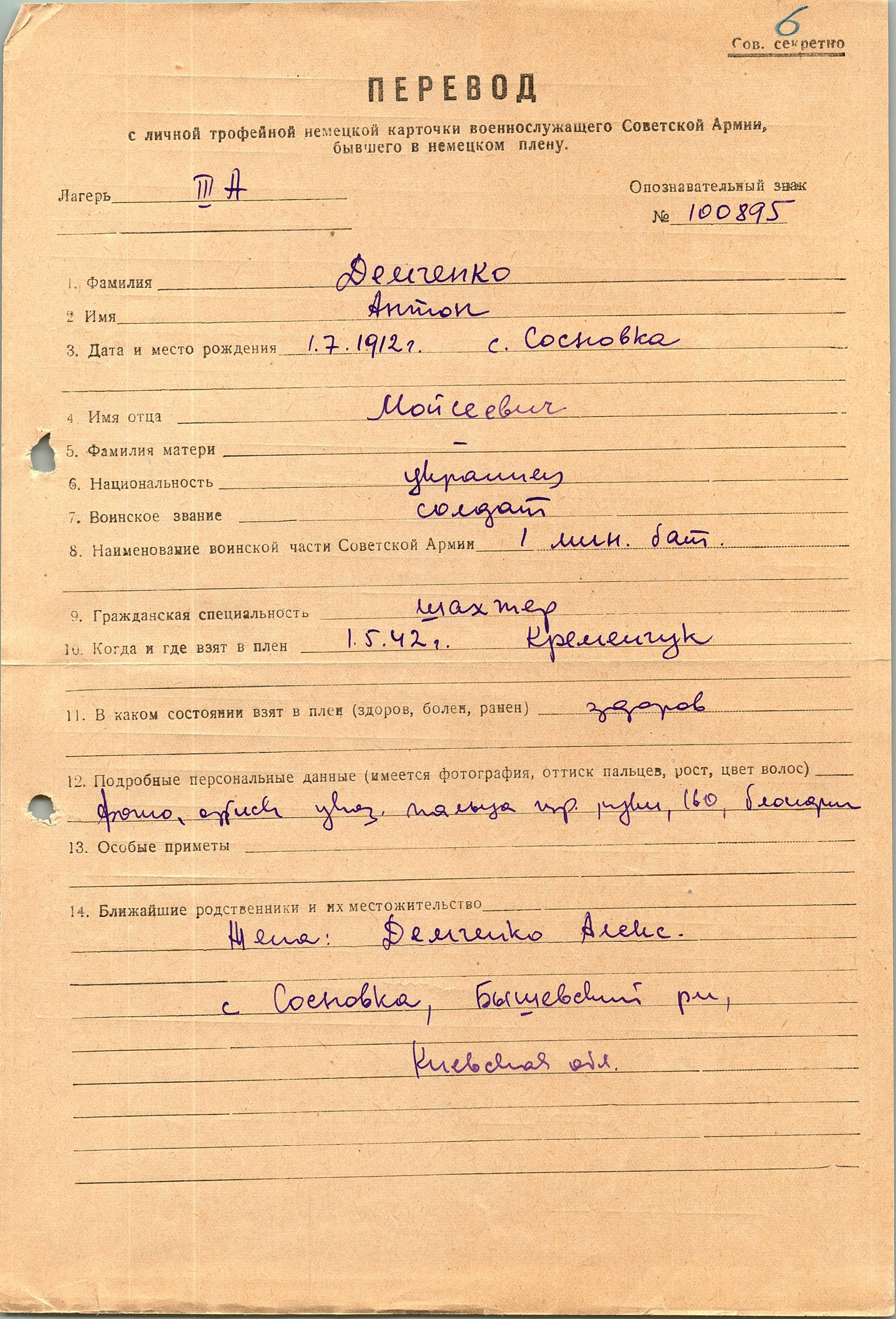 Демченко Антон Моисеевич, 01.07.1912 г., с. Сосновка. Рядовой, 1 мин. батальон. Попал в плен 01.05.1942 г. в г. Кременчуг, 20.10.1943 – отправлен в команду 45, Ибердресс.