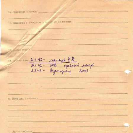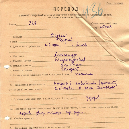 Дугил Георгий Александрович, 02.09.1910 г. р., Киев. Рядовой, пехота. Попал в плен 02.11.1942 г. в районе Харькова. 02.02.1943 г. – отправлен в Вустрау.