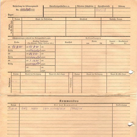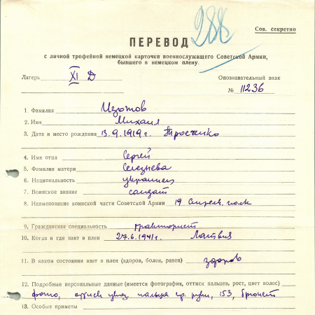 Изотов Михаил Сергеевич, 13.09.1919 г. р., с. Троещина, Броварской р-н., Киевская обл. Рядовой, 19 стрелковый полк. Попал в плен 27.06.1941 г. Латвия. 13.10.41 – Саксенхаузен/Берлин.