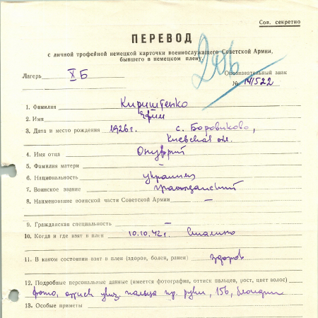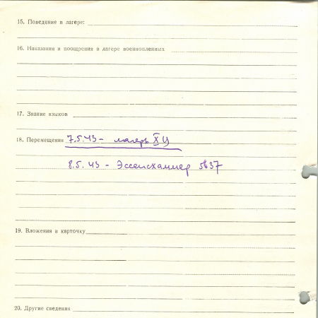 Криштенко Ефим Онуфриевич, 1926 г. р., с Боровиково, Киевская область. Гражданский. Попал в плен 10.10.1942 г. в Сталино. 08.05.1943 г. – отправлен в Эссенсхаммер 5637.