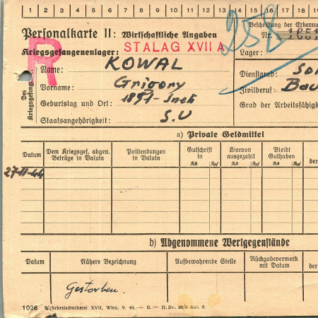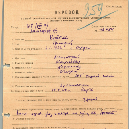 Коваль Григорий Дмитриевич, 06.01.1922 г. р., с. Озера, Киевская область. Рядовой, 165 стрелковый полк. Попал в плен 15.05.42 г. в г. Керчь. 17.08.1943 г. – отправлен в гарнизон, финансово-хозяйственный отдел, р-н Мариенберг.